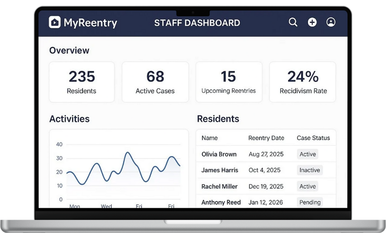 Reentry is not a solo journey. Our support dashboards give authorized family members, case navigators, and correctional partners visibility into progress, needs, and milestones — improving communication, coordination, and accountability across the entire support network.